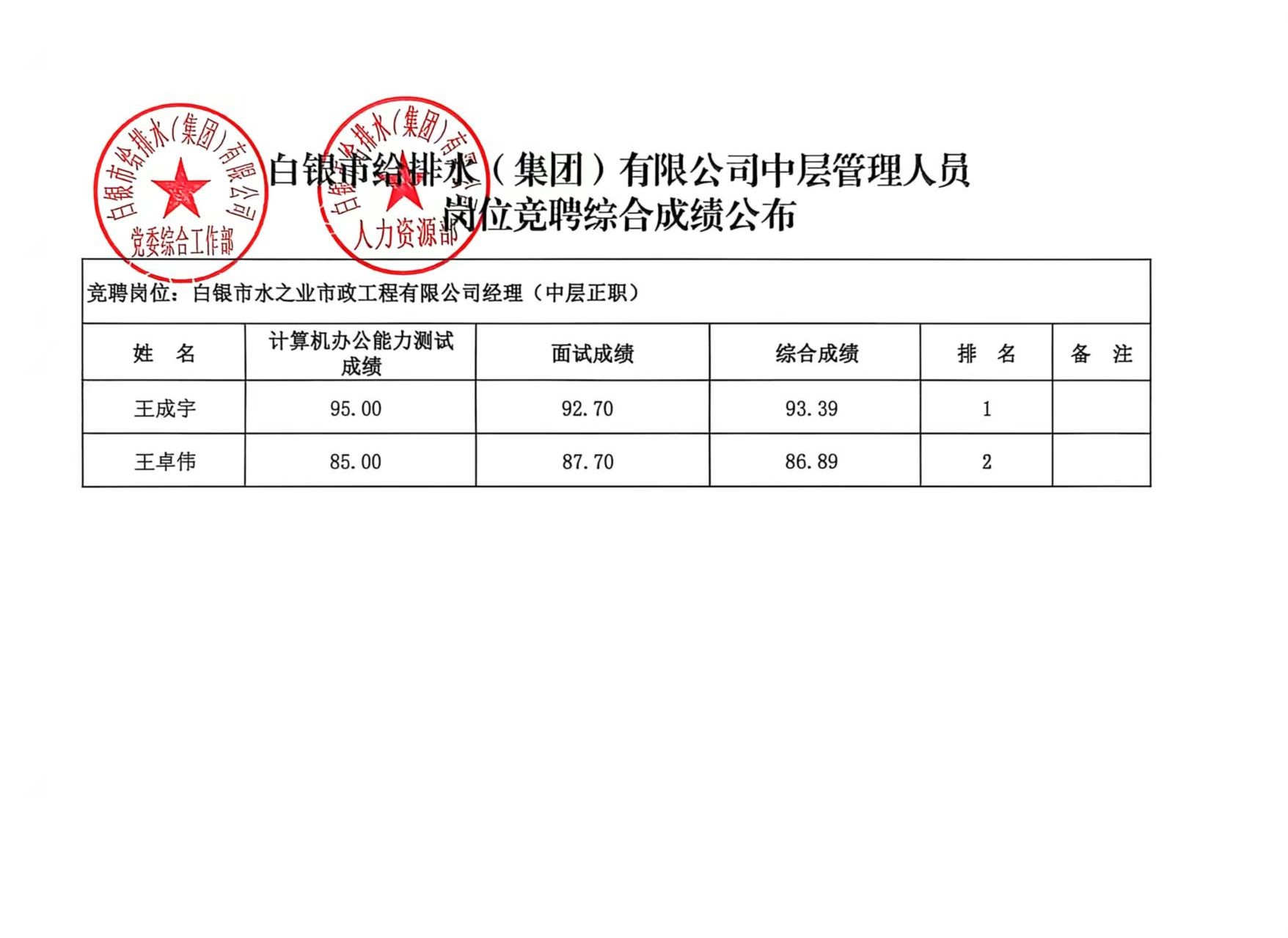 白銀市給排水(集團)有限公司中層管理人員崗位競聘綜合成績(jì)公布